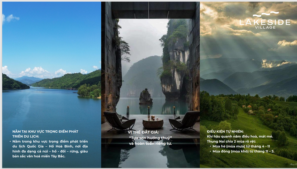 Dự án Lakeside Village tọa lạc tại khu vực thuộc hai xã Bình Thanh và Thung Nai, huyện Cao Phong, tỉnh Hòa Bình. Nơi đây nằm gọn trong lòng thung lũng Thung Nai, nơi có biển hồ rộng lớn, thiên nhiên hùng vĩ đa dạng với núi rừng bao trọn xung quanh, tựa như một chốn thiên đường tách biệt hẳn với thế giới ồn ã, xô bồ bên ngoài kia.
