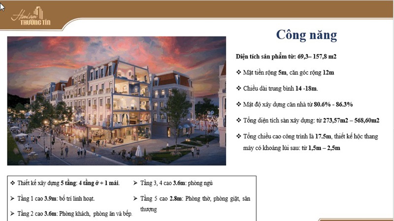 Quy mô: 159 căn gồm 17 shophouse 2 mặt tiền và 142 Liền kề.