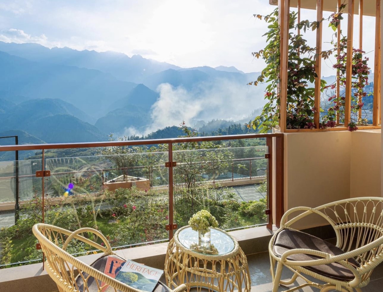 – Ban công với tầm nhìn tuyệt đẹp ra thung lũng Mường Hoa, núi Hàm Rồng và thị trấn Sapa
