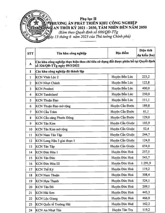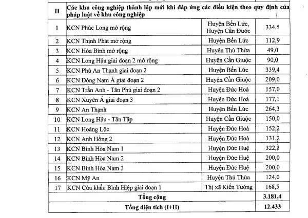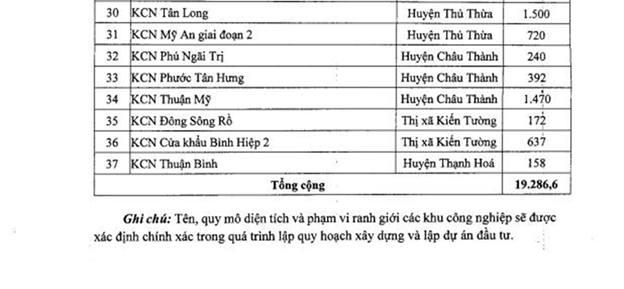 Đến năm 2030, Long An sẽ có 17 khu công nghiệp thành lập mới với diện tích tăng thêm gần 3.200ha, nâng tổng số khu công nghiệp của toàn tỉnh lên 51 khu với diện tích gần 12.500ha. Với số lượng trên, Long An sẽ là địa phương đứng thứ 2 (sau Bình Dương) cả nước về diện tích các khu công nghiệp, tạo điều kiện và cơ hội lớn để thu hút đầu tư.