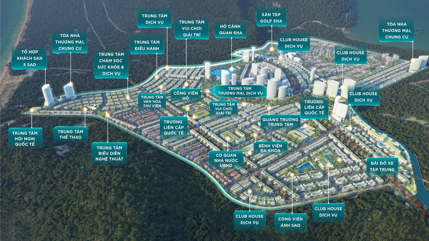 Hồ điều hòa, nhà hát lan tỏa Dream Theather, sân khấu nổi, đài phun nước, chòi vọng cảnh, lối dạo bộ, mê cung ngọc trai, công viên hoa, vịnh ngư dân, đồng cỏ cổ tích, triển lãm nghệ thuật, quảng trường, khu vực Interactive Art – Nghệ thuật tương tác, vườn nướng BBQ…08 Club House chủ đề: