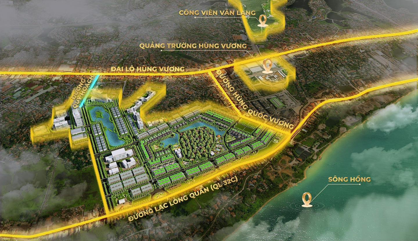 – Vị trí 3 mặt đường lớn: Hùng Quốc Vương, Lạc Long Quân (Quốc lộ 32C) và đường quy hoạch thông ra Đại lộ Hùng Vương; Phường Minh Nông, Việt Trì (cách Quảng trường Hùng Vương 500m)