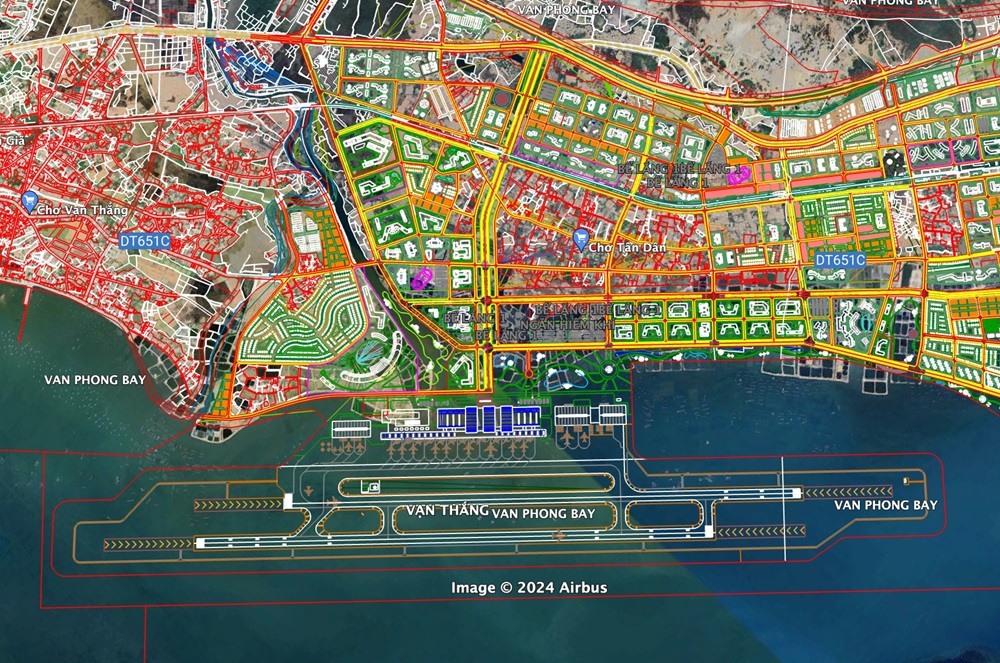 Tổng diện tích đất quy hoạch CHK Vân Phong khoảng hơn 497 ha, trong đó khu vực dự kiến quy hoạch sân bay nằm hoàn toàn trên vùng mặt nước ven bờ, không có dân cư, rừng bảo hộ, rừng ngập mặn, di tích lịch sử và không có quy hoạch khu neo đậu tàu thuyền, tránh bão.